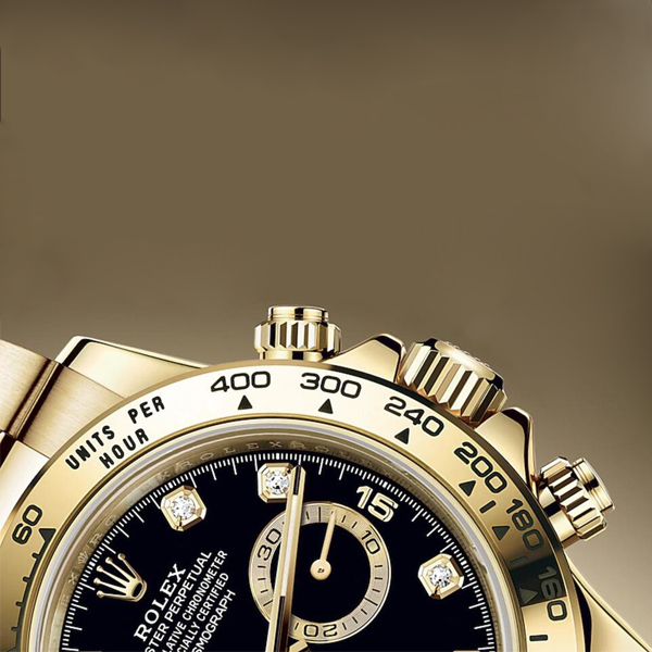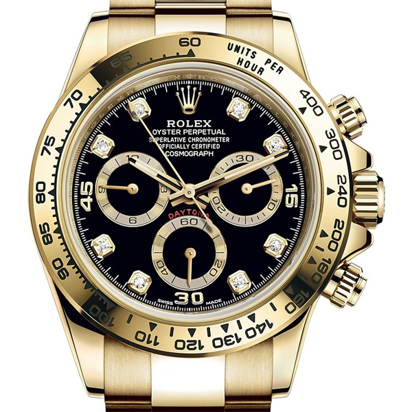 Hour, minute, and second hands in the center, with small seconds (at 6 o’clock). Chronograph and totalizer measuring up to 1/8 second (30 minutes at 3 o’clock and 12 hours at 9 o’clock). Accurate time setting with second hand stop function