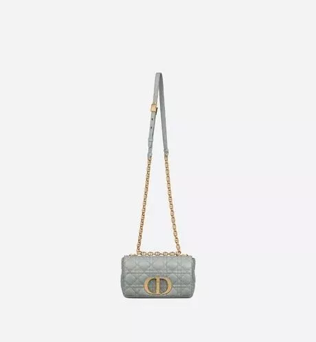 The “Dior Caro” bag combines timeless elegance and modernity. It is made of supple grey calfskin with “cannage” stitching. The flap is adorned with an antique gold-tone metal “CD” twist clasp inspired by the stoppers of Dior perfume bottles. Attached to the detachable “CD” signature chain shoulder strap with a linked chain, it can be carried as a handbag, shoulder bag or crossbody, or it can be replaced by a wide embroidered strap from the Maison for day and night styling.