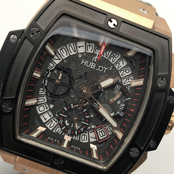 Bezel: Satin-finished, polished, microblasted black ceramic with 6 H-shaped titanium screws