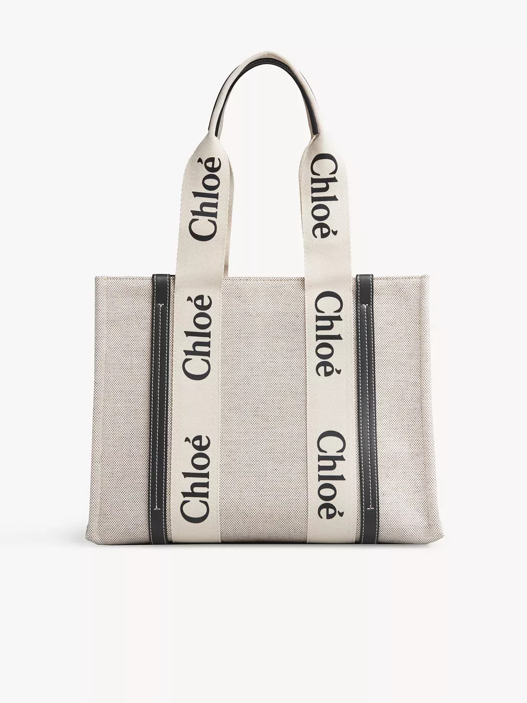 “WOODY” medium tote bag made of cotton canvas and shiny calfskin with “WOODY” ribbon